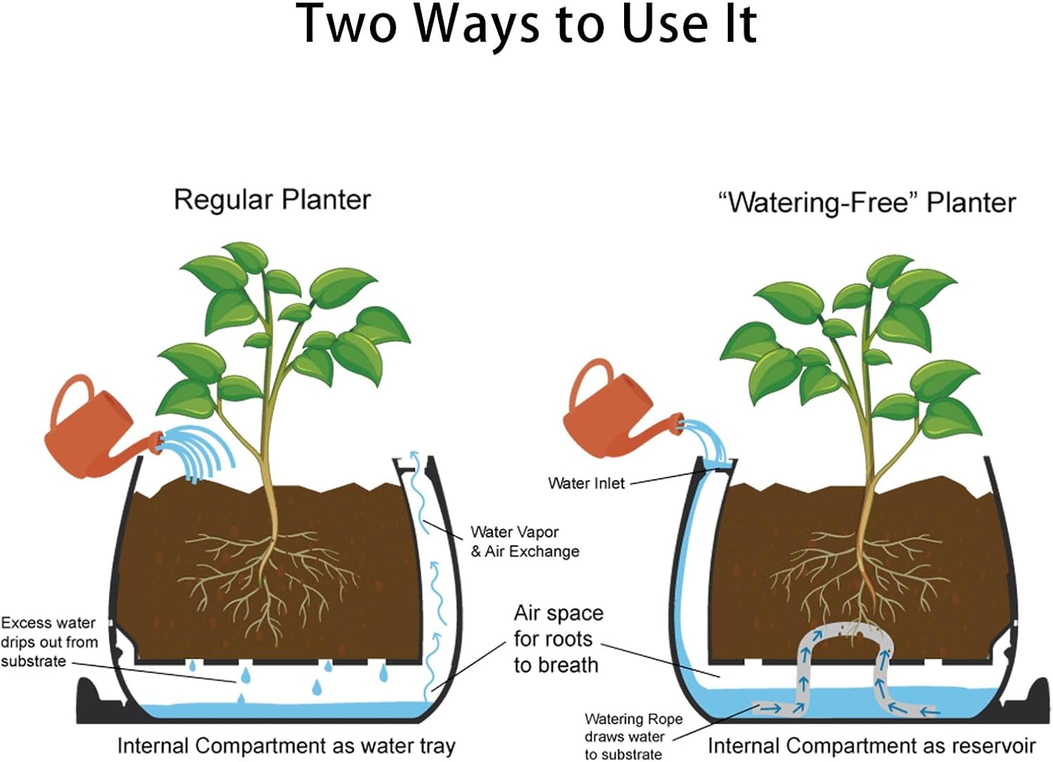 Self-Watering System: The enclosed watering channel allows water to flow directly to the reservoir base without wetting the plant and soil, thus preventing root rot and waterlogging. The watering cotton rope can gradually channels water from the reservoir base into the soil layer, providing the necessary moisture for healthy root growth. Our self-watering system keeps your plants happy and hydrated for up to two weeks, ensuring they get water even whether you're away or have a busy schedule.