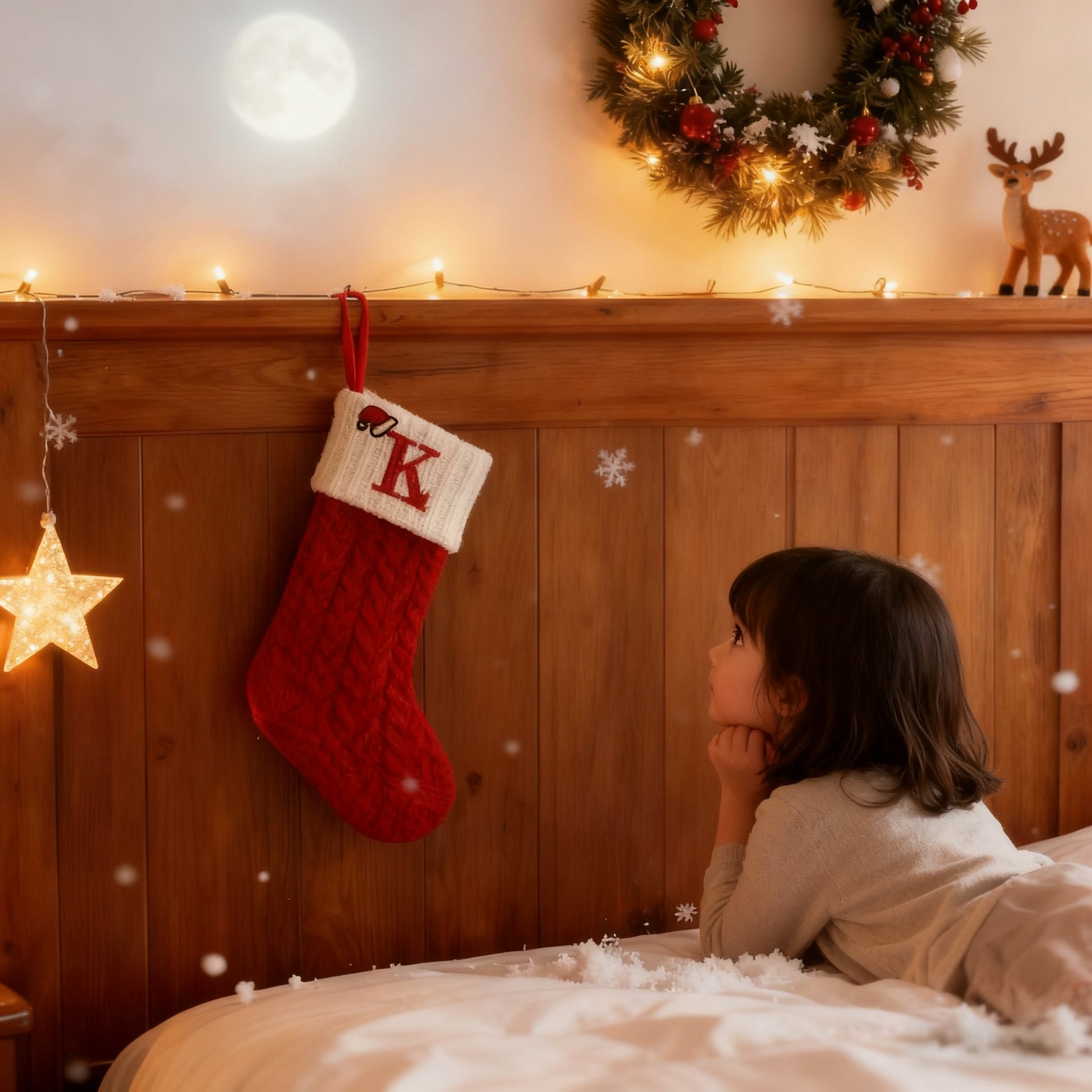 - Family Christmas Eve:In a cozy home, the whole family hangs their letter-customised Christmas stockings by the bedside. The children wait eagerly before bed, and the parents fill them with small gifts. The surprise of Christmas morning starts with this exclusive stocking.